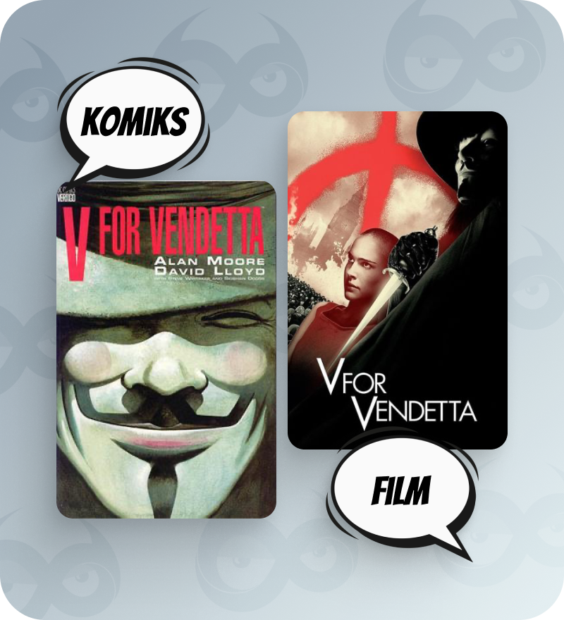 Uznávaný komiks V for Vendetta je priamou kritikou britskej vlády 80. rokov. Dej sa odohráva v dystopickom Spojenom kráľovstve, kde vládnu totalitní fašisti. Hlavná postava V (vo svojej ikonickej maske) chce pomstiť režim a zároveň inšpirovať ľudí k zničeniu celej spoločenskej štruktúry. Komiks necháva čitateľom priestor na to, aby si vytvorili názor o tom, či je V hrdina alebo šialenec.