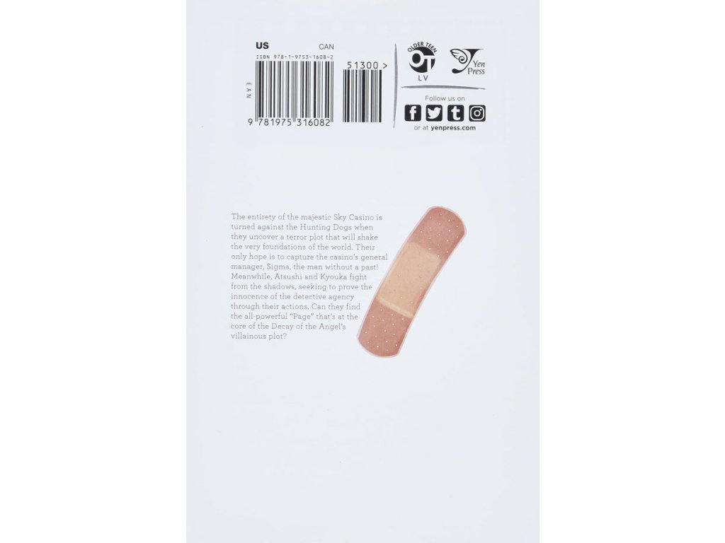 The entirety of the majestic Sky Casino is turned against the Hunting Dogs when they uncover a terror plot that will shake the very foundations of the world. Their only hope is to capture the casino’s general manager, Sigma, the man without a past! Meanwhile, Atsushi and Kyouka fight from the shadows, seeking to prove the innocence of the detective agency through their actions. Can they find the all-powerful “Page” that’s at the core of the Decay of the Angel’s villainous plot?