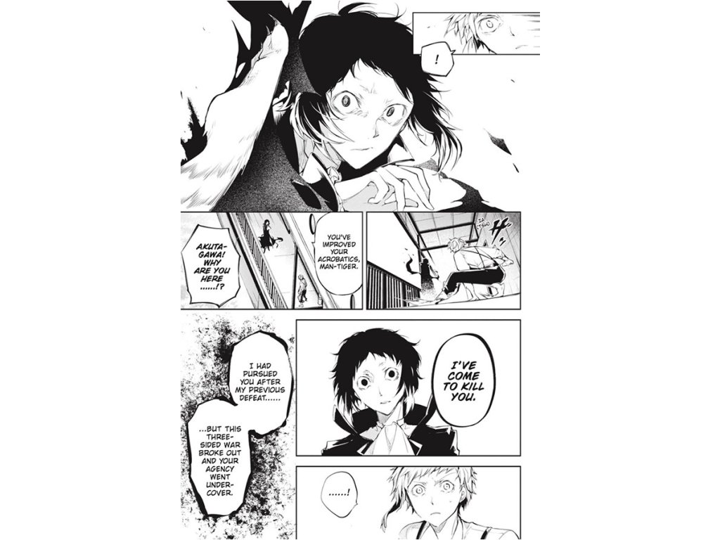 With only minutes to stop the Moby-Dick from crashing down on Yokohama, Atsushi encounters his nemesis, Akutagawa! However, the face-off turns into a three-man battle when Fitzgerald enters the fray. Can Atsushi and Akutagawa counter the Guild leader's extravagant ability in time to stop the white whale's descent...?!