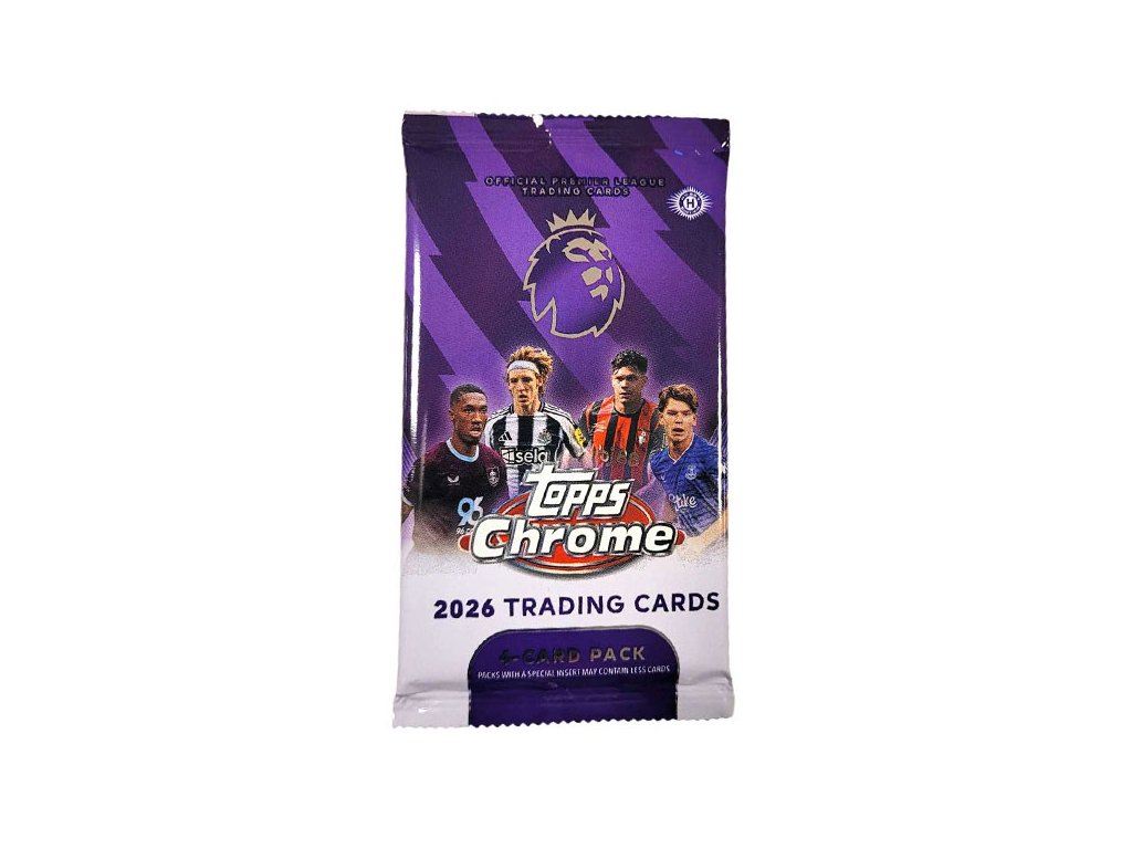 Hobby balíček zberateľských futbalových kariet Topps Chrome Premier League 2026. Obsahuje 4 karty. Hľadaj inserty, limitované karty alebo podpisy!