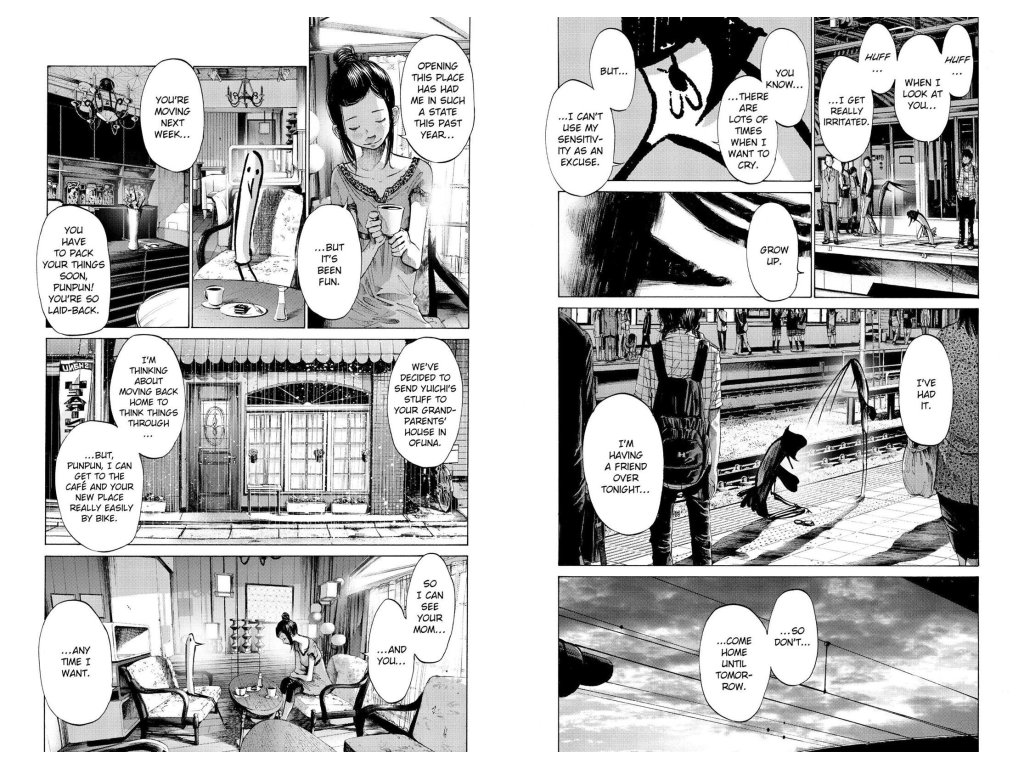 This is Punpun Onodera’s coming-of-age story. His parents’ marriage is falling apart. His dad goes to jail, and his mom goes to the hospital. He has to live with his loser uncle. He has a crush on a girl who lives in a weird cult. Punpun tries talking with God about his problems, but God is a jerk. Punpun keeps hoping things will get better, but they really, really don’t.