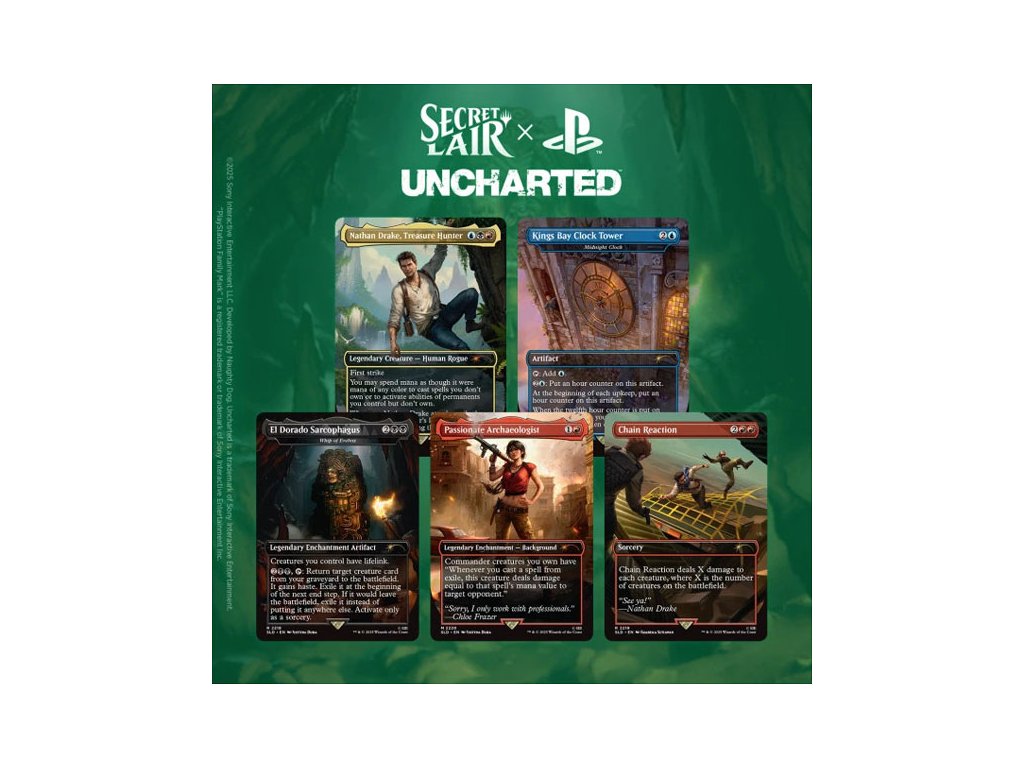 Secret Lair x PlayStation – Uncharted prináša adrenalín a vzrušenie z obľúbenej hernej série priamo do sveta Magic: The Gathering. Táto exkluzívna spolupráca medzi Wizards of the Coast a PlayStation obsahuje päť unikátnych kariet inšpirovaných napínavými výpravami Nathana Drakea, starobylými ruinami a honbou za stratenými pokladmi.