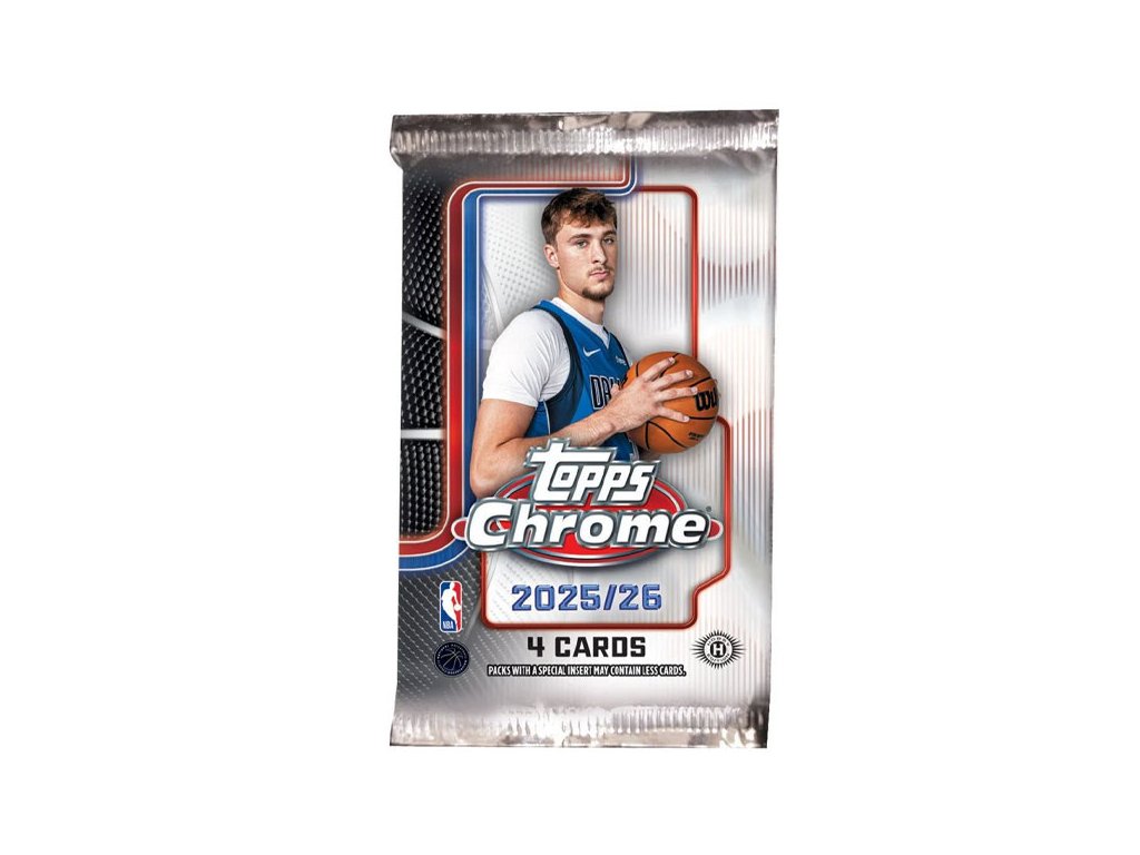 Balíček zberateľských basketbalových kariet Topps Chrome NBA 2025/2026. Obsahuje 4 karty. Hľadaj vzácnere fraktory, podpisy či limitované karty!