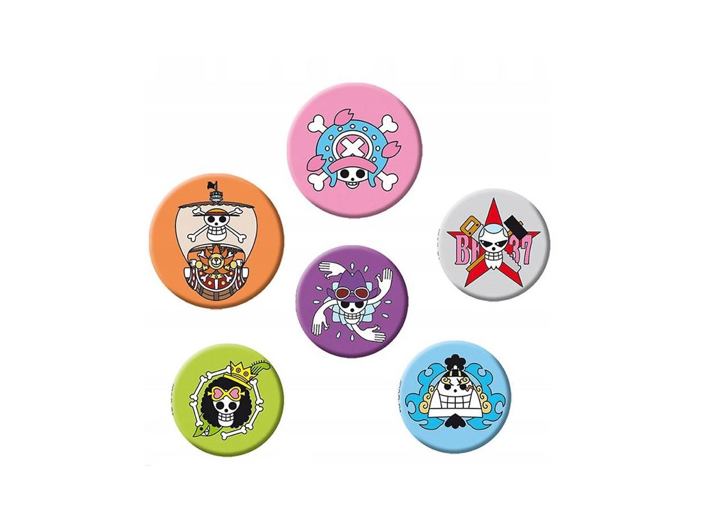 Sada okrúhlych odznakov s motívmi postáv z manga a anime série One Piece. Obsahuje 5 plechových odznakov. Ozdob si oblečenie a ukáž, že si fanúšik!