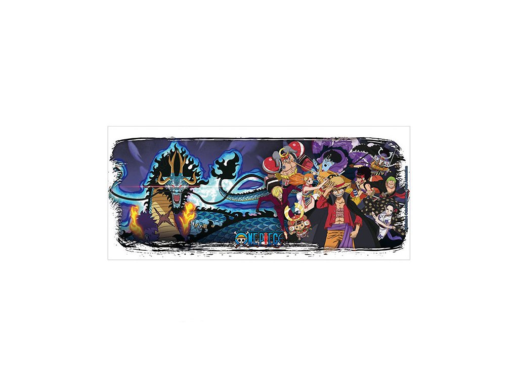 Šálka zobrazuje scénu z Wano Raidu, jednej z najdôležitejších udalostí v sérii. Obrázok je detailný a jasný a zobrazuje Luffyho, Zora a Jinbeho a ďalších.