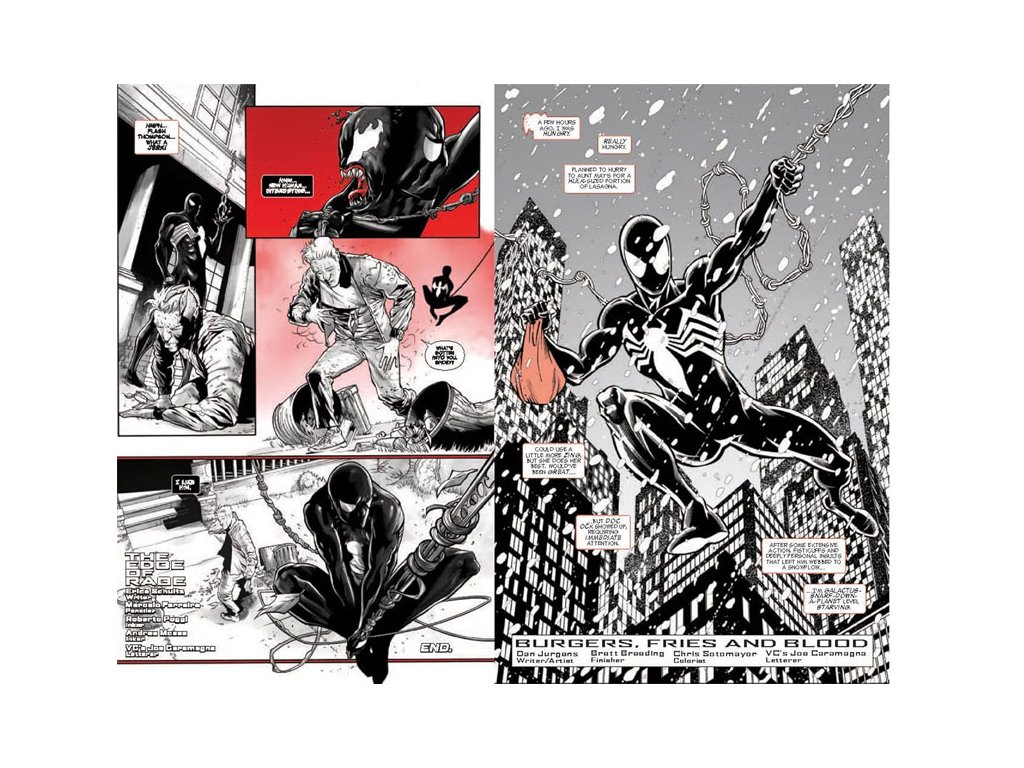 Hviezdna zostava scenáristov a výtvarníkov sa spojila, aby priniesla nové príbehy Spider-Mana! J. M. DeMatteis sa vracia k stránkam legendárneho komiksu „Kravenov posledný lov“, aby vyrozprával doteraz nezverejnený príbeh zo Spideyho minulosti. J. Michael Straczynski vytrhne srdce Petrovi Parkerovi (aj symbiontovi)! Úžasné spracovanie lezca po stenách od Dustina Nguyena vynesie Spideyho do nevídaných výšin. Greg Weisman a Javi Fernández zavedú Petra a jeho symbiontí oblek až na samotnú hranu. Spidey od Ericy Schultz a Marcela Ferreiru nepozná zľutovanie! Legendárny Dan Jurgens píše a ilustruje odvážny nový pohľad na jednu z najikonickejších kapitol Spider-Manovho života. A čaká vás toho oveľa viac – v odvážnej čiernej, bielej a krvavo červenej!