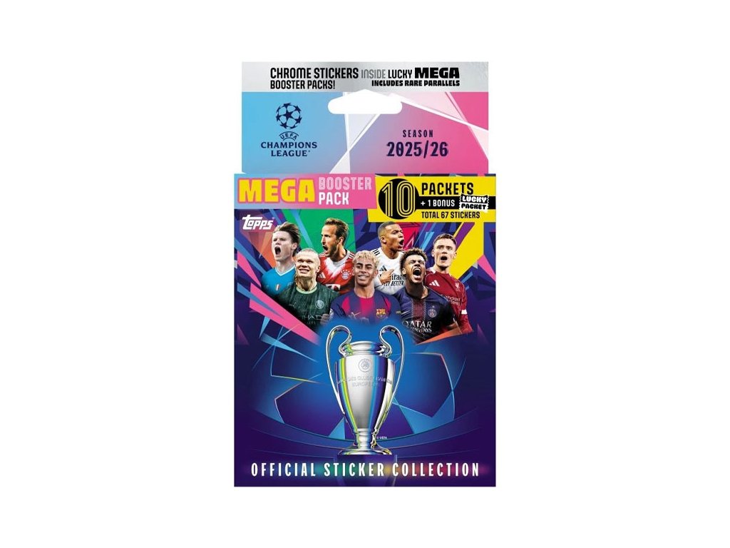 Zberateľské futbalové samolepky Topps Champions League 2026. Mega Eco Pack obsahuje 10 balíčkov po 6 nálepiek a bonusový balíček. Zaháj zbierku už dnes!