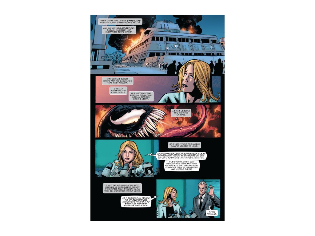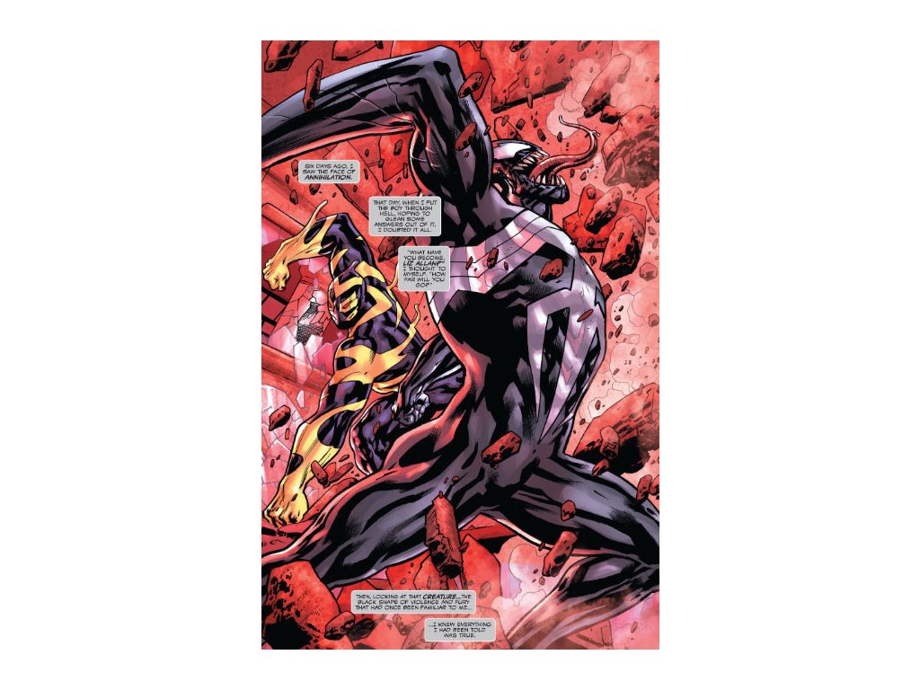 Dylan Brock, nový Venom, je v boji o život - a možno v ňom bude sám! Kým sa Dylan a jeho symbiont učia žiť spolu bez Eddieho Brocka, Life Foundation aktivovala nového smrtonosného agenta menom Spearhead! Dylan a Venom nie sú jediní, na ktorých má namierené - cieľom je každý jeden symbiont, ktorý oni (a vy!) kedy poznali a starali sa o neho! Ešte pred pár dňami si Dylan myslel, že jeho najväčším problémom je posadnutosť jeho otca ako pána symbiontov - Kráľ v čiernom. Teraz Eddie odišiel - a jedinou stopou po ňom je Venom! Ale bez Eddieho vedenia je Dylan pripravený naplniť svoj osud a podľahnúť tej istej temnote, ktorej kedysi podľahol jeho otec?